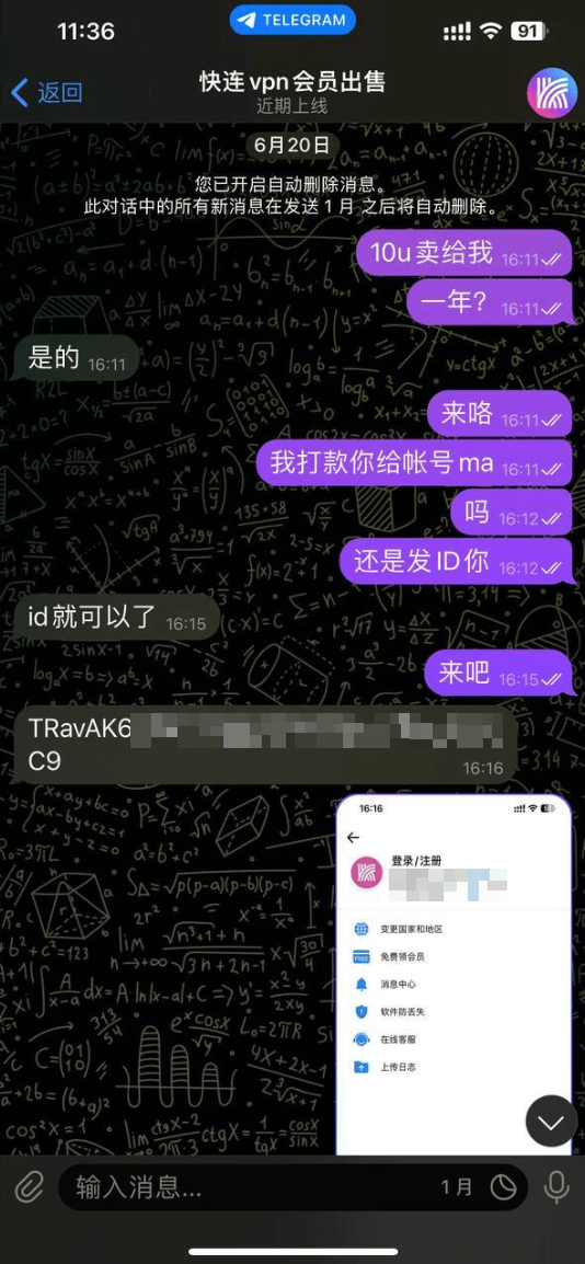 在 Telegram上,”我“ 被一则声称通过“特殊渠道”仅需 10u 便能年购快连 VPN 的广告吸引。广告中的产品标志和精心设计的文案让我误以为找到了正规特价分销商。被这样的诱惑所迷,我几乎没有犹豫,立即通过虚拟货币快速完成了购买。然而,我的钱刚一转出,就被广告发布者拉黑了,一切联系方式全都断了。后续与快连 VPN 客服反馈沟通中得知,已有上千人和我一样受骗,损失损失惨重。